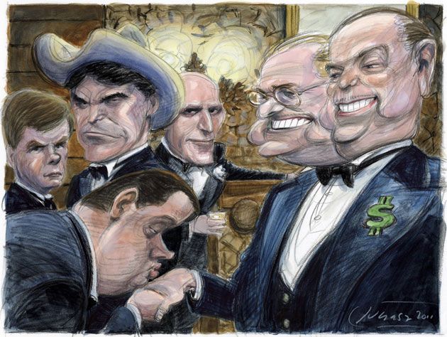 Οι εταιρείες "Freedom partners", "Generation opportunity", "Heritage" μέσω των οποίων διακινήθηκαν αυτά τα μηνύματα έχουν κάτι κοινό: Ανήκουν στους αδελφούς Charles και David Koch, 77 και 73 ετών οι οποίοι έχουν βάλει όλα τα πλούτη τους (26,4 εκατ. ευρώ) σε έναν και μοναδικό σκοπό: να αποσταθεροποιήσουν τον σοσιαλιστή Μπαράκ Ομπάμα. Εδώ και μήνες ένας ολόκληρος γαλαξίας από Ιδρύματα, κέντρα εκδηλώσεων κλπ, με ακροδεξιές απόψεις, συνέλαβαν και εκτέλεσαν το σχέδιο της κρίσης προϋπολογισμού που παρολίγον να παγώσει την Αμερική.