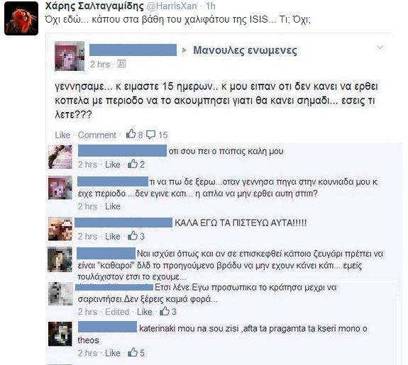 Αντί να βρεθεί έστω και ένας να της πει, μην ανησυχείς κοπέλα μου, αυτά είναι άθλιες δεισιδαιμονίες και προλήψεις, κάνε ό,τι σου πει ο γιατρός, αντί να βρεθεί ένας τέτοιος λογικός να της απαντήσει, αρχίζει να ξεδιπλώνεται ο βούρκος της αμάθειας και της δεισιδαιμονίας, που μπροστά σε αυτή τη συζήτηση οι τζιχαντιστές του Ισλαμικού Κράτους μοιάζουν τουλάχιστον με δεκαπέντε μεταπτυχιακά ο καθένας.